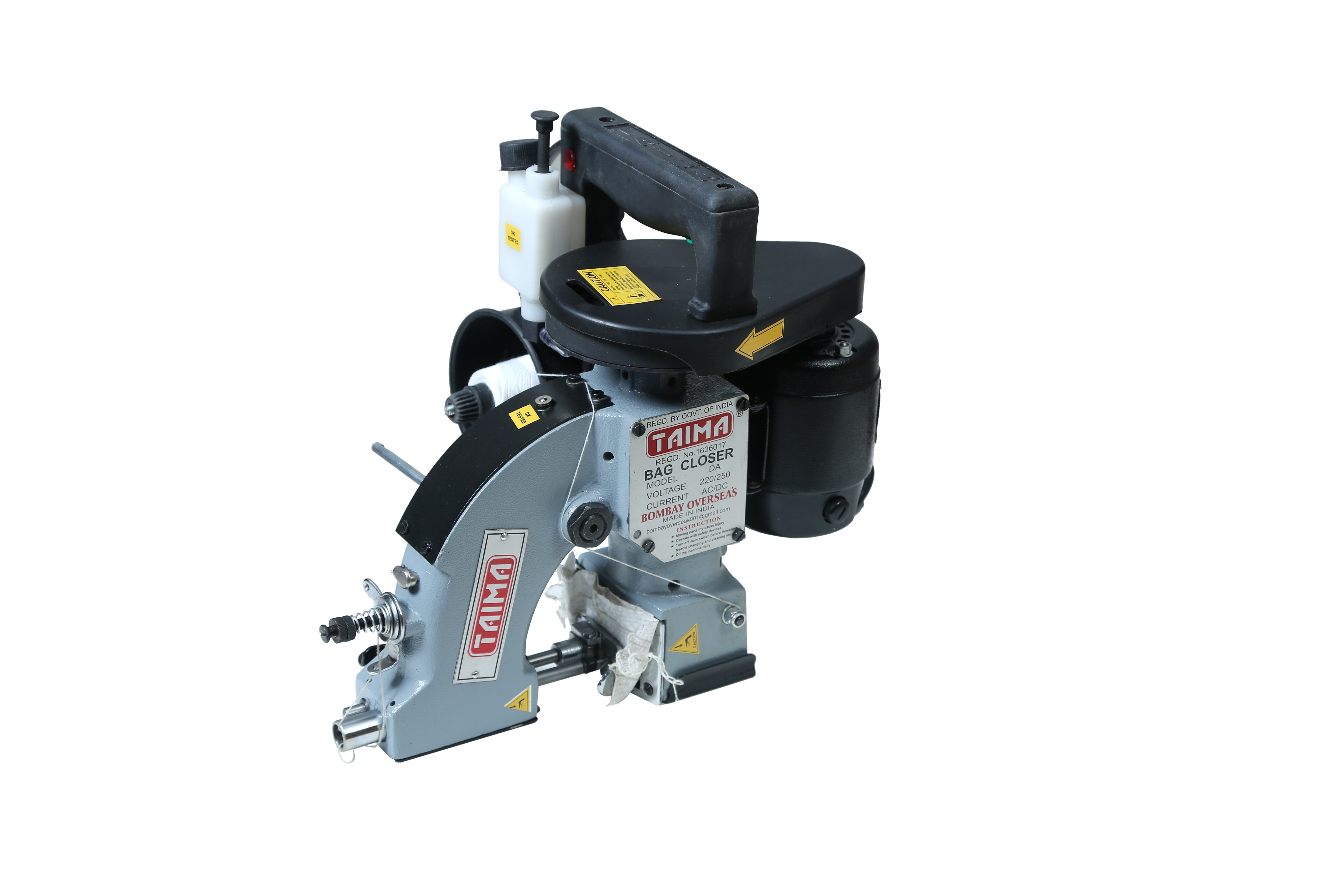The carry home carry around TAIMA model. A light weight Bag Stitching Machine. This model has a facility for Single Thread Chain stitching ideally suited for stitching bags of Agricultural products animal feeds , chemical flour etc. It may also conveniently stitch paper Cotton & Hession bags.